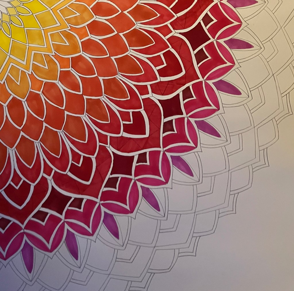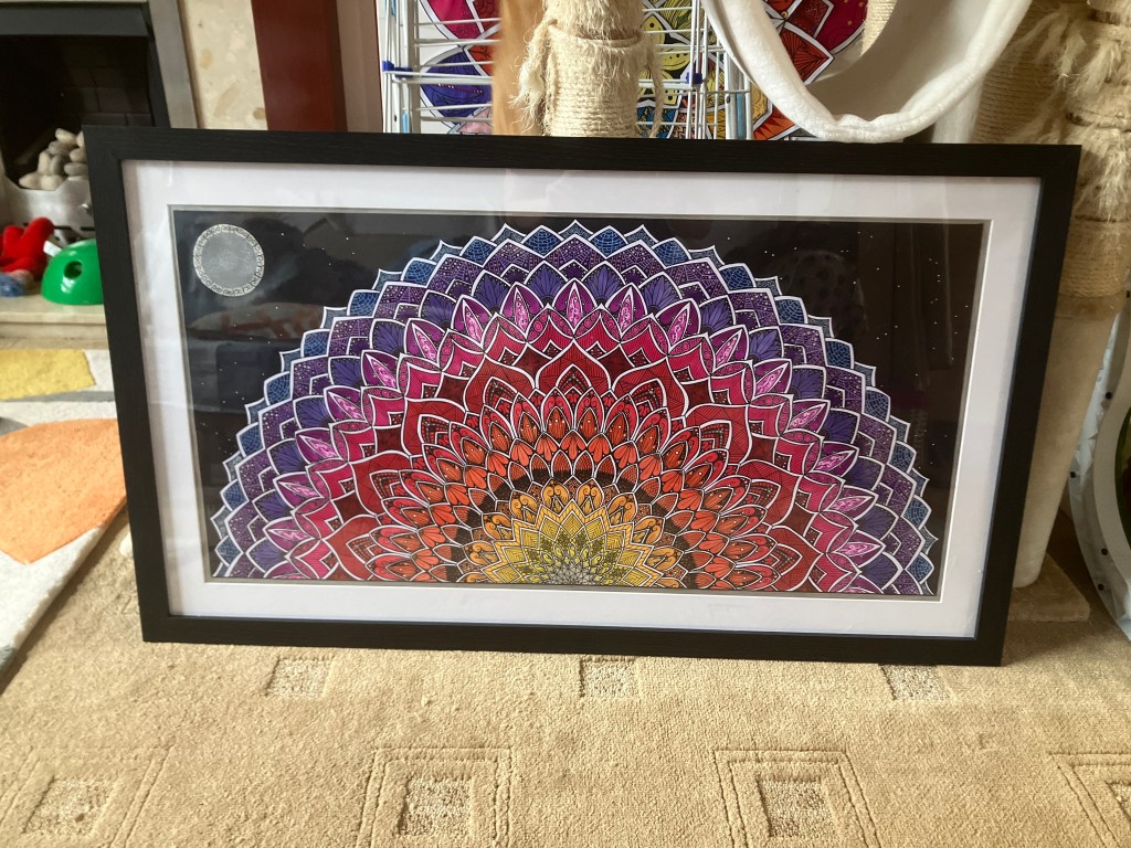 At 40cm x 80cm, Sunset is the largest mandala that I have ever created and included an investment in a much larger compass! Created for an exhibition in Consett it now has pride of place on my wall!